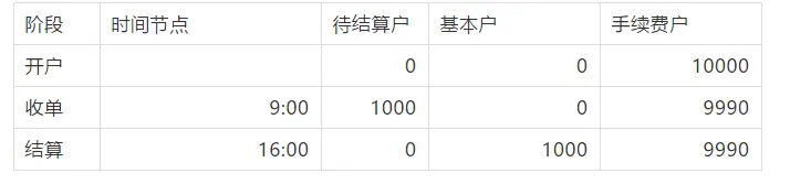 手续费按照1%标准收取,有商户支出,该笔交易手续费为1000*1%=10元,计入手续费账户,手续费剩余9990.
