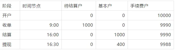商户提现600元后,基本户剩余400,手续费账户剩余9988。