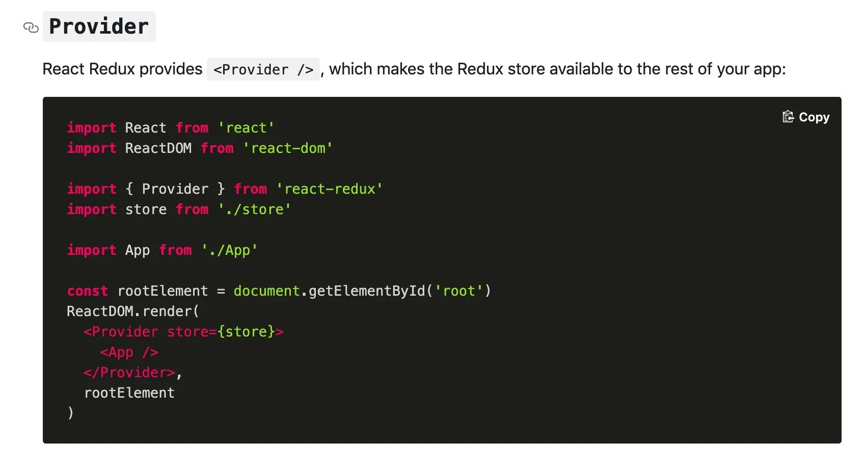 根据 React-Redux 官网的实例,我们在使用的时候需要引入 Provider 组件,然后将其包裹在我们的根组件外边,传入 store 数据:
