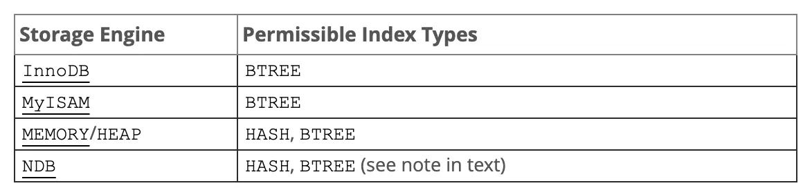 根据Mysql官方文档描述,InnoDB和MyISAM支持BTREE,MEMORY/HEAP和NDB支持HASH和BTREE