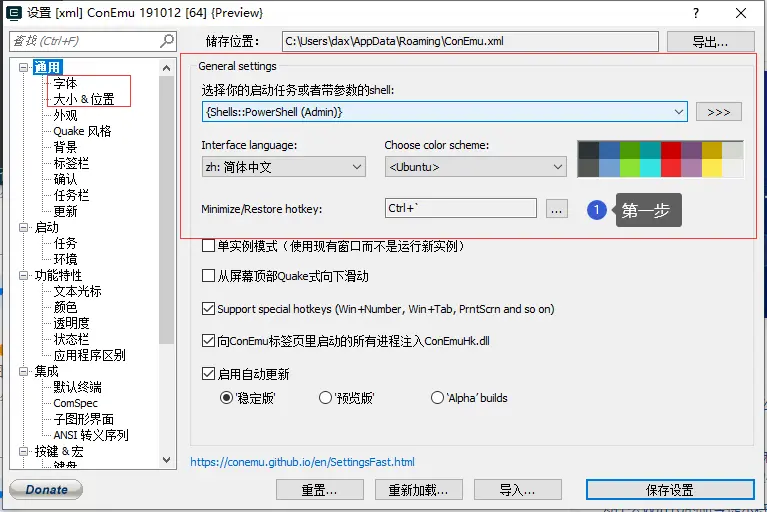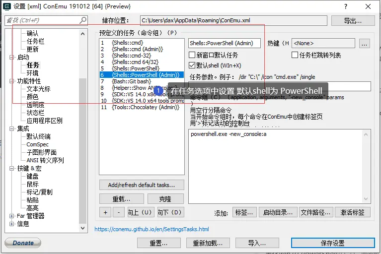 安装完毕后,在启动菜单中打开 ConEmu 进入设置(标题栏右键选择 Settings)界面,选择 PowerShell Admin 并设置为中文: