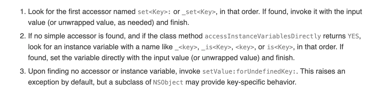 1、setValue:forKey:首先会去查找set<Key>或_set<Key>方法,如果没有且accessInstanceVariablesDirectly返回YES,则会去查找_<key>、_is<Key>、<key>或is<Key>的实例变量。如果返回NO,则会抛出一个异常。