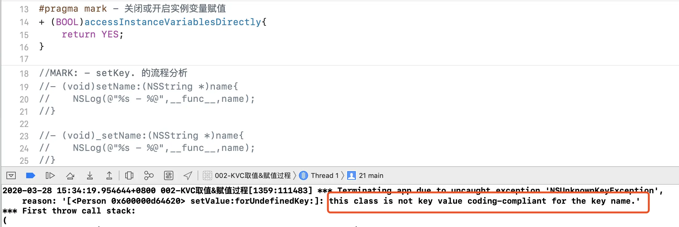 3、如果都没找到,就回调用setValue:forUndefinedKey:,并且类方法accessInstanceVariablesDirectly返回NO,就会抛出一个异常