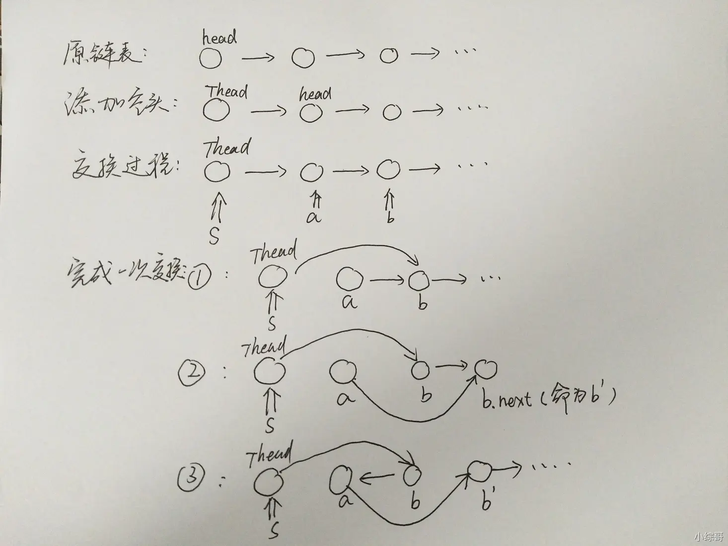 给定一个链表,两两交换其中相邻的节点,并返回交换后的链表。 你不能只是单纯的改变节点内部的值,而是需要实际的进行节点交换。 事例: