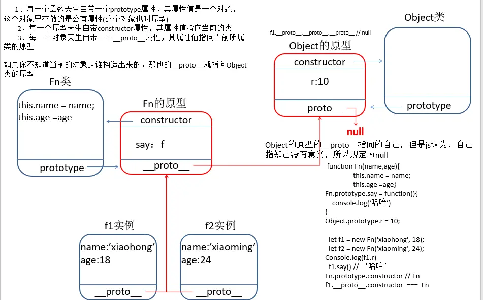 - 每个函数天生自带一个prototype属性,其属性值是一个对象,这个对象里存储的是供实例调取的公有属性(这个对象也叫原型)