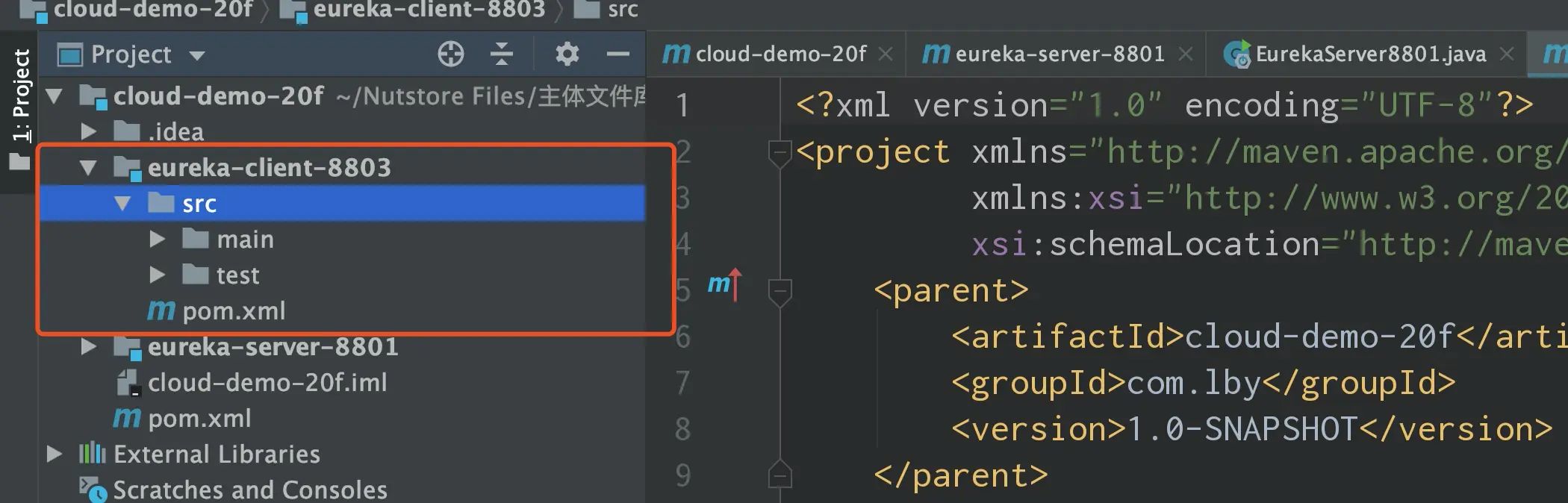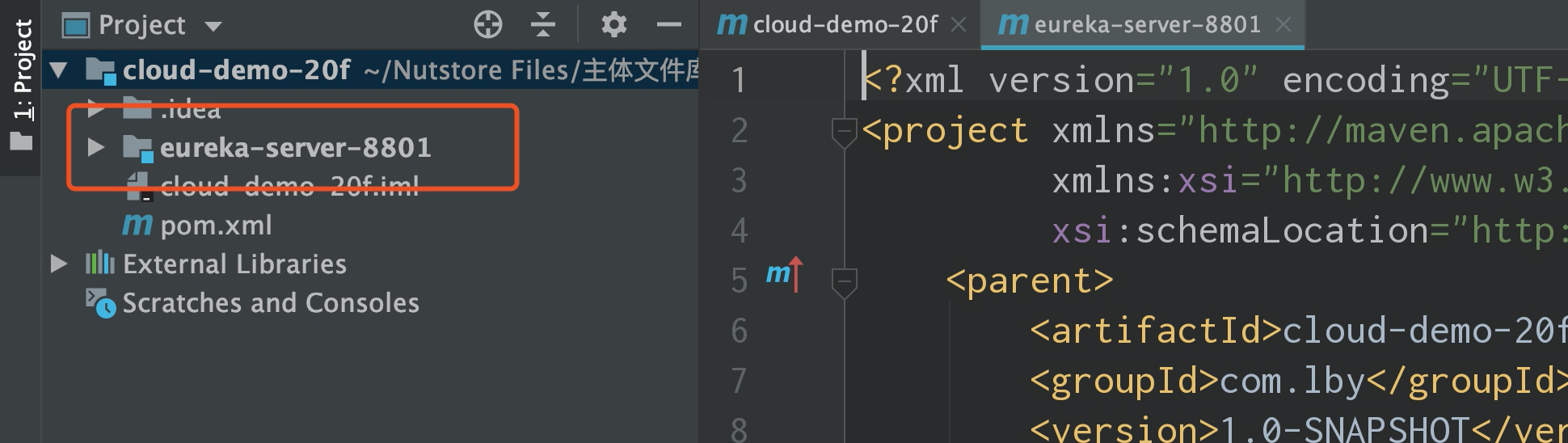 ❝观察pom文件可以发现,eureka-server-8801项目已经自动继承了父项目
