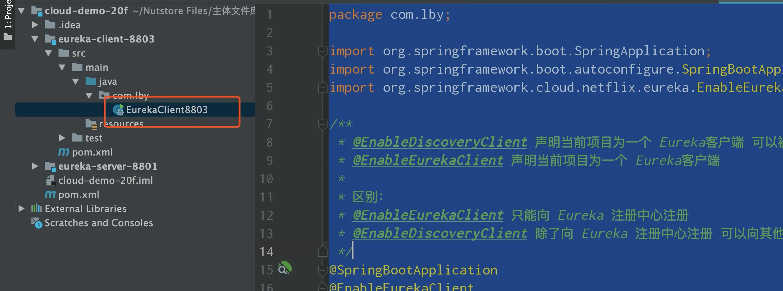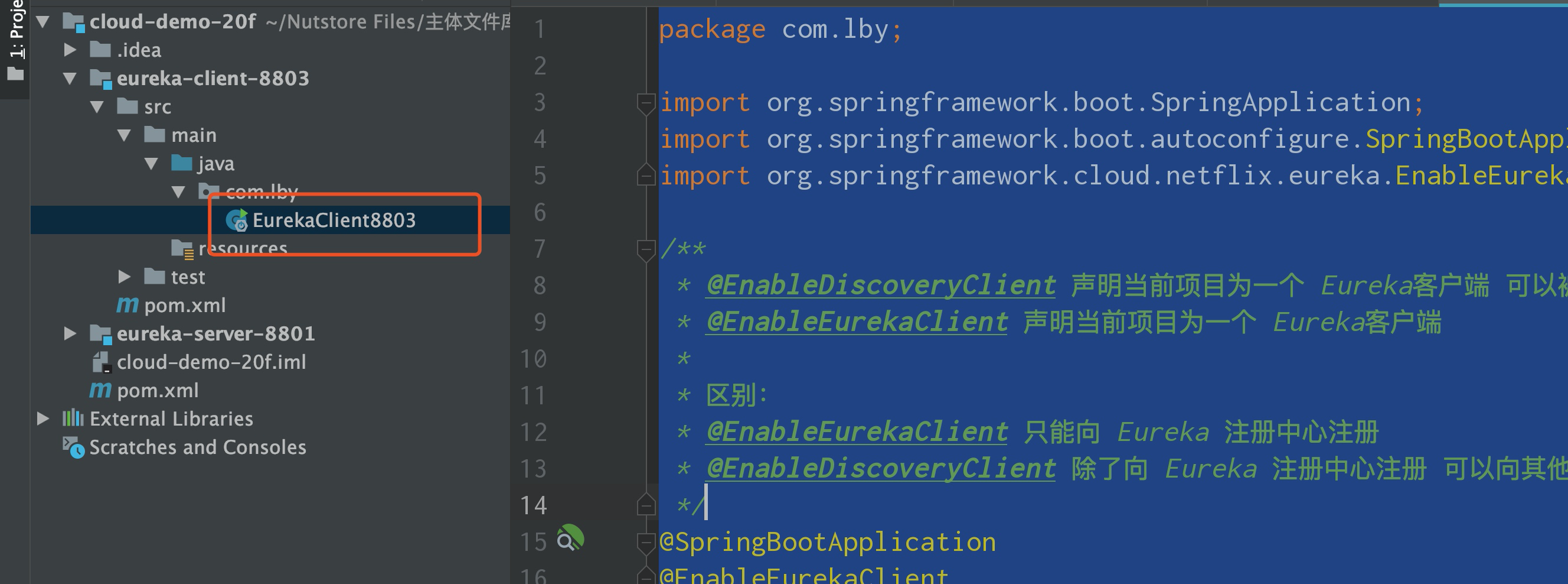 * @EnableDiscoveryClient 声明当前项目为一个 Eureka客户端 可以被发现的客户端