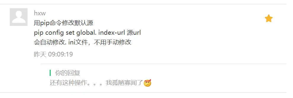网上很多关于换源的教程,大部分都是通过在C盘下的某个文件夹新建个什么文件,然后在复制一些东西进入。但是我感觉,还是有点麻烦,我们大Python要求的就是简洁,方便。这里使用了读者留言的方法,十分的简洁,详情如下。