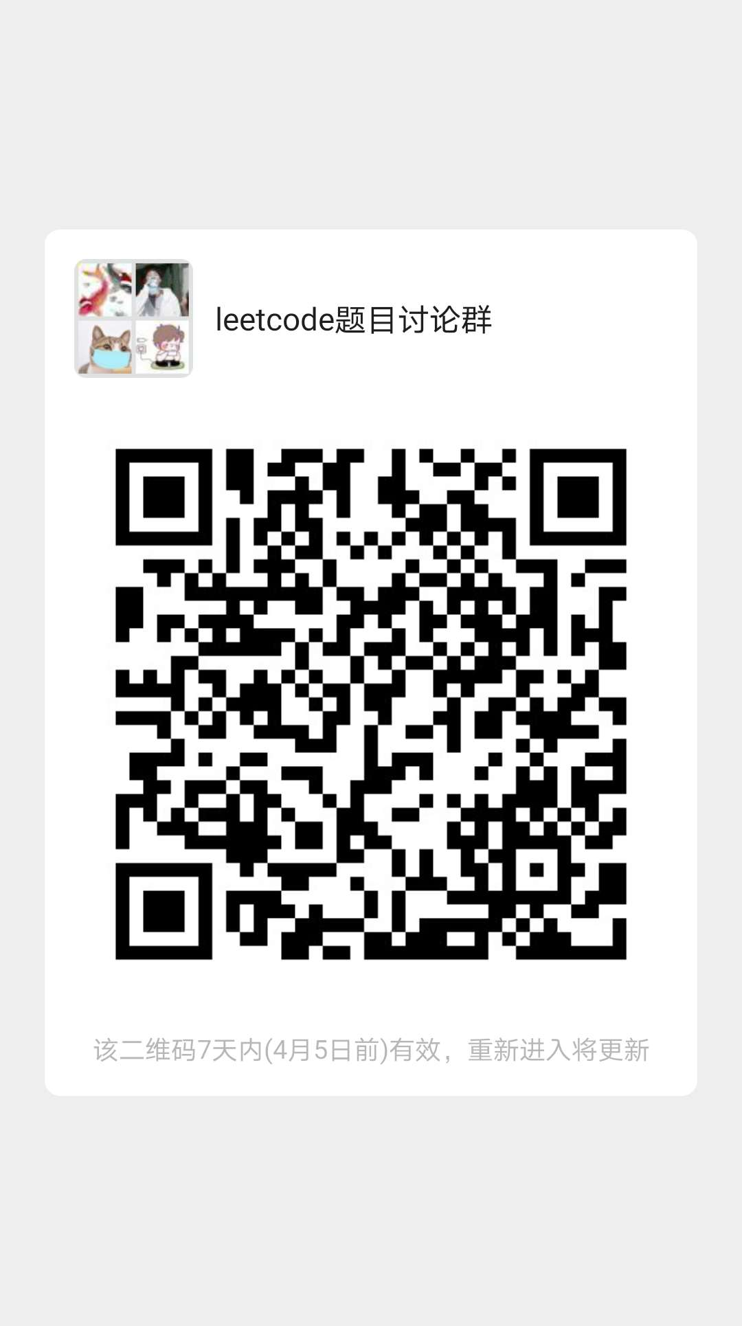 平时空闲的时候就可以刷刷题,相互交流交流,提供自己的水平,岂不是美滋滋?下方是群的二维码,欢迎加入哦~ leetcode讨论群(如果下面链接失效了,欢迎给我的公众号:我想问问天 发消息,我再把你拉进去):