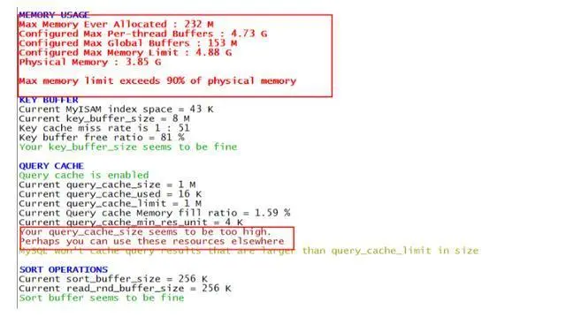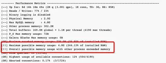 1)重要关注[!!](中括号有叹号的项)例如[!!] Maximum possible memory usage: 4.8G (244.13% of installed RAM),表示内存已经严重用超了。