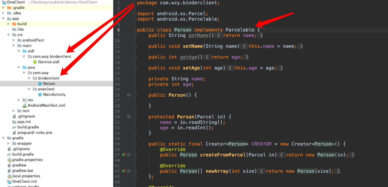 1,客户端 a,客户端要在自己的工程目录下面引入服务器创建的aidl文件,也可手动创建(手动创建的aidl必须和服务器包名路径一致),个人理解就是要在服务器上面去注册,代码和服务器代码一样,person是自定义的数据类型,要在客户端建立服务器包名的下的person类,person类要实现Parcelable接口