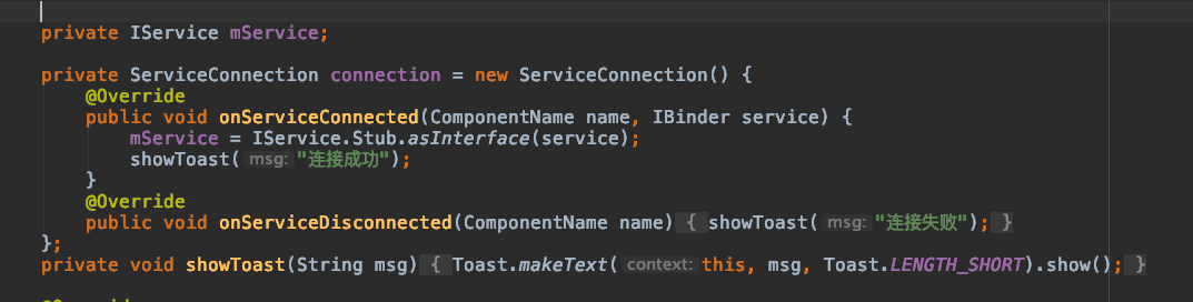 d,客户端向服务器发送简单的数据 ,首先要拿到连接服务器返回的IService代理对象mService对象,然后拿着这个mService对象,如果显示连接成功,就可以拿着这个mService 对象就可以向服务器发送数据了。
