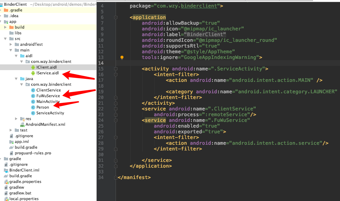 2,服务器 a)简单理解通信协议的制定者,如果客户端要和我通信,就必须按照我的通信协议格式来,才可以连接成功。比如创建的IService.aidl接口协议,创建的Person类,客户端要和我创建的协议名和路径要完全一致,否则通信就会失败。