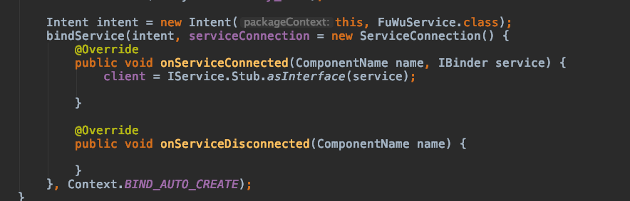 c,客户端连接服务器代码 ,调用代码bindService代码,intent的action要设置服务器配置文件中service中添加的action,intent还要设置服务器包名(简单理解成要连接那个服务),代码和图片的关系如下图: