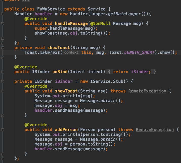 发送简单的数据类型比如String类型,直接调用IService.aidl接口中定义好的方法 mService.showToast("这是客户端发送的数据") 如果发送自定义数据类型,直接调用IService.addPerson(person)对象,客户端的代码完成了,下面请看服务器短的代码。