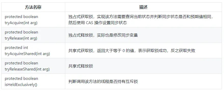 提供了一个基于 FIFO队列,可以用于构建锁或者其他相关同步装置的基础框架。该 抽象队列同步器(以下简称队列同步器)利用了一个 private volatile int state来表示 同步状态,期望它能够成为实现大部分同步需求的基础。使用的方法是继承,子类通过继承同步器并需要实现它的方法来管理其状态,管理的方式就是通过类似 acquire获取 和 release释放 的方式来 操纵状态。然而 多线程环境中对状态的操纵必须确保原子性,因此子类对于状态的把握,需要使用这个同步器提供的以下三个方法对状态进行操作: