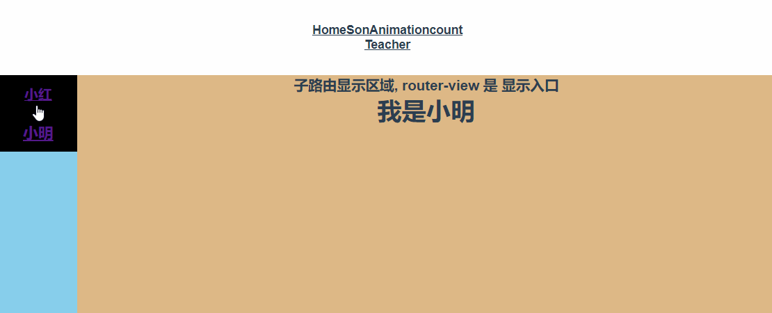 2. 页面中使用 通过 <router-link to="/父路由path/嵌套path">小红</router-link>