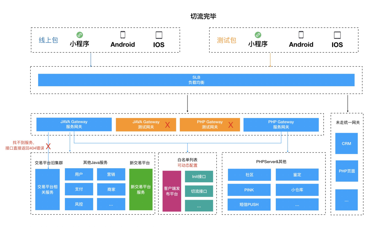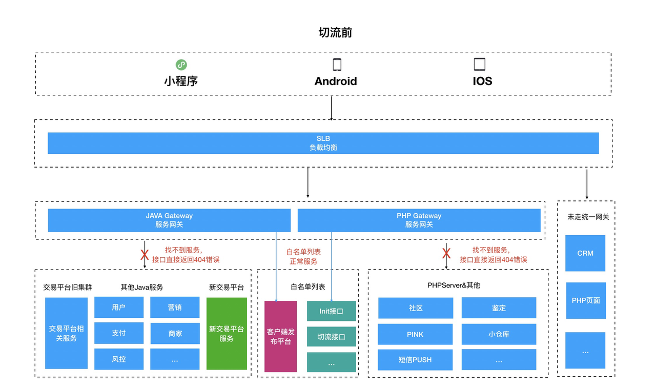 - 切流期间的用户:旧功能可用 -> 旧功能停服 -> 开启切流路由切换到新功能