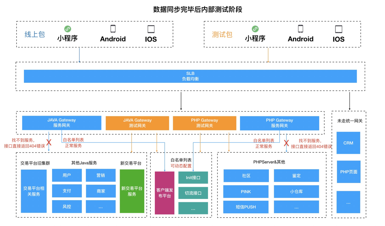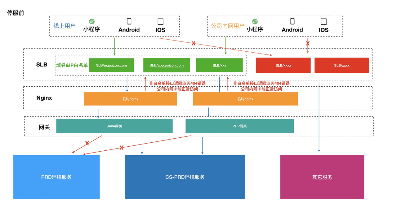 - 涉及到验证客户端&小程序&H5停服,slb流量拦截、slb白名单接口可行、 数据库锁表可读,开启白名单接口可访问,数据增量迁移,数据校验,内部切流后新功能验证,切流预演后端配置还原等(在后续详细SOP步骤列出)
