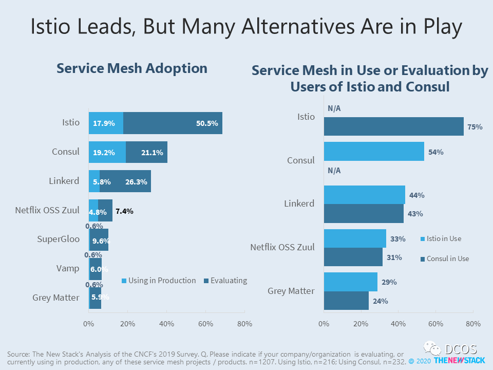 虽然Envoy在Kubernetes ingress代理上远远落后于领导者Nginx(Envoy为19%,而NGINX为62%),但在将Istio应用到生产环境的受访用户中有18%发生了转变,其中有47%用户开始使用Envoy进行Kubernetes ingress代理。从另一种纬度来看,使用Envoy进行Kubernetes ingress代理的用户中有39%的人同时将Istio的应用到生产环境。
