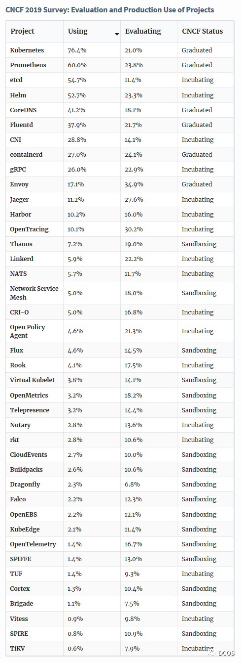 本文最后列出了正在使用和评估的CNCF项目。 我们希望这些数据能为CNCF准则的关于项目有效性的讨论提供支撑,这些准则涉及评估哪些项目应该处于沙盒化阶段,哪些处于孵化以及哪些准许毕业。