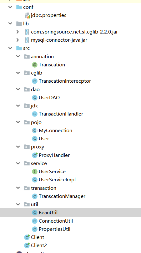 spring中有两种动态代理实现技术,JDK动态代理和Cglib动态代理。JDK动态代理基于接口,Cglib动态代理基于继承,都是在使用反射,在程序运行时执行。我两种都去试用了,但最后用到事务管理的是cglib。原因嘛,就是我实现完事务管理就很累了,不想再写第二遍