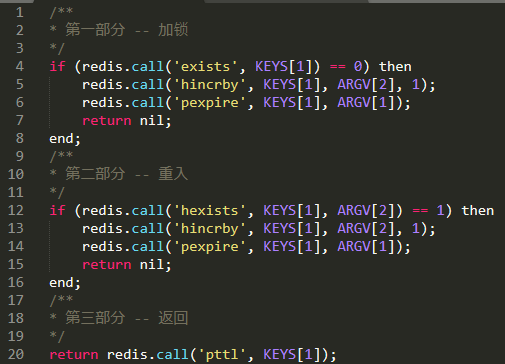 看到这里的时候,解锁的 lua 脚本都不必看的,想也能想到,肯定是有一个减一的操作,然后减到 0,就释放这把锁。