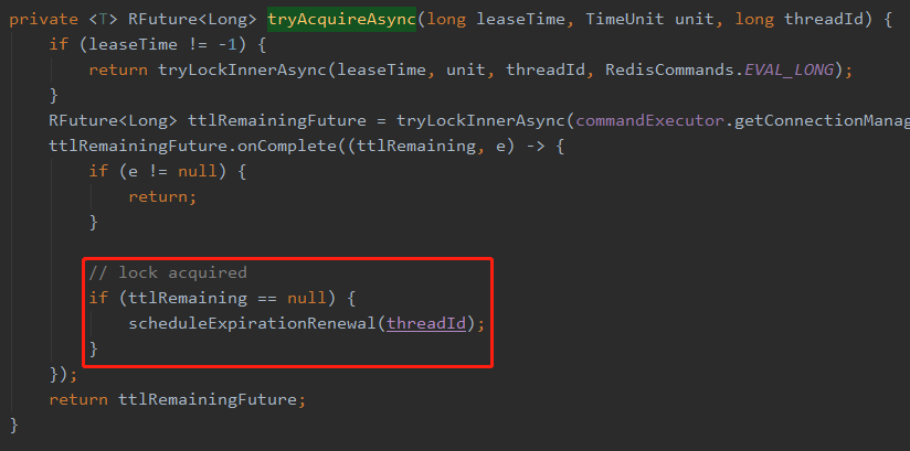 tryAcquire 的代码我们之前分析过,当 ttl 不为 null 时,只有一种情况,那就是加锁失败: