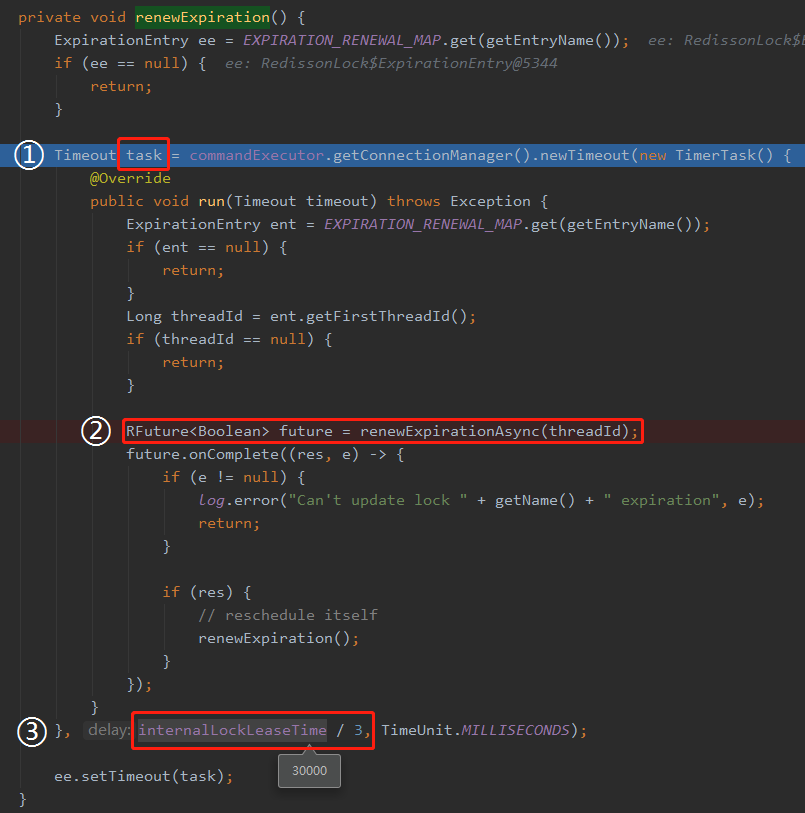 ③:该任务每 internalLockLeaseTime/3ms 后执行一次。而 internalLockLeaseTime 默认为 30000。所以该任务每 10s 执行一次。