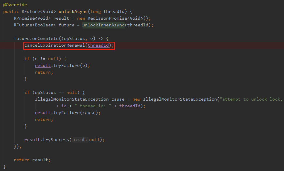 其实就是在执行完解锁的 lua 脚本之后,通过响应式编程,完成了 cancel 操作。