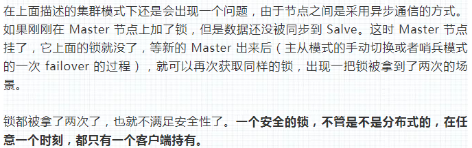 分布式锁的一致性要求 CP,但是Redis 集群架构之间的异步通信满足的是 AP ,因此对不上呀,就是有问题的啊。
