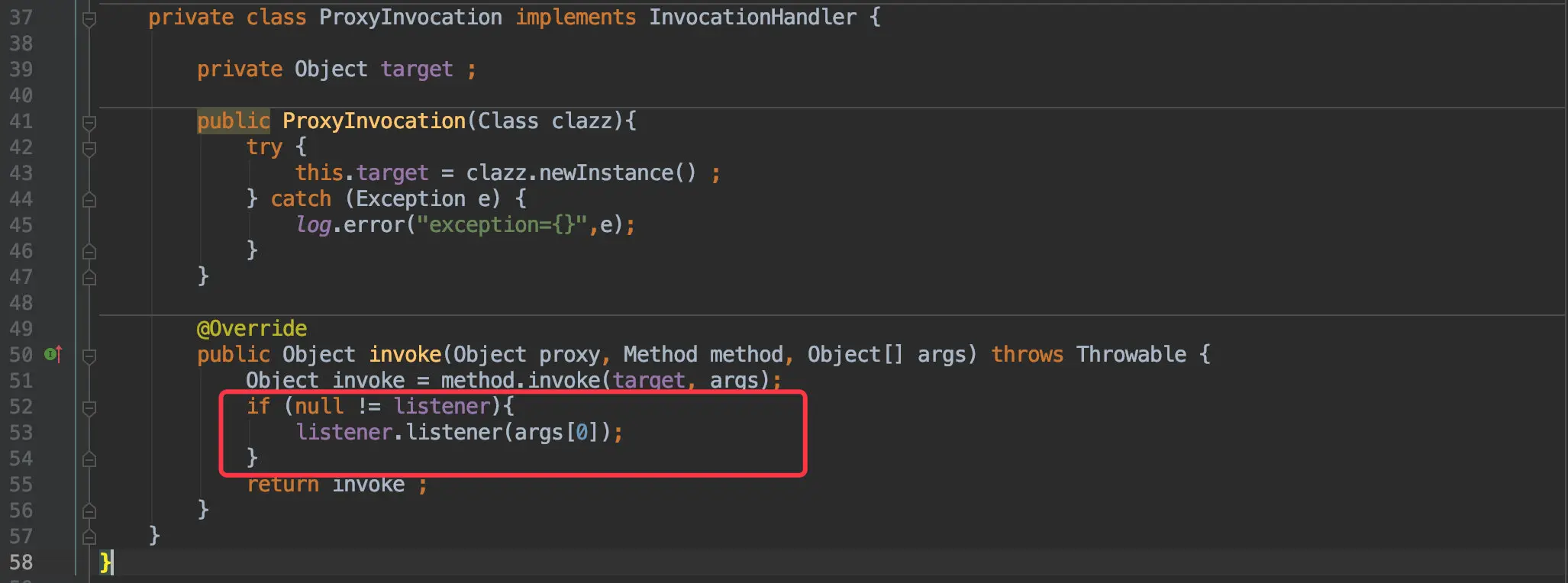 总之这样便可以创建一个 DBHandler 接口的代理对象,而真正的代理过程是在 InvocationHandler#invoke() 函数中实现的: