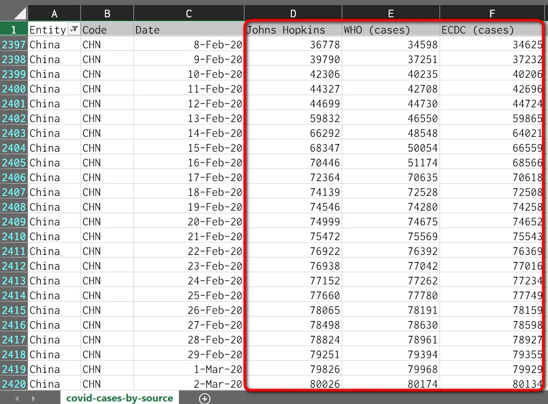 下载到本地是一个csv文件,其中有三个数据源,分别来自Johns Hopkins(美国一所常青藤大学), 世界卫生组织WHO和ECDC(欧洲疾病预防和控制中心). 我们选择其中一列即可,本文我选择Johns Hopkins提供的数据。