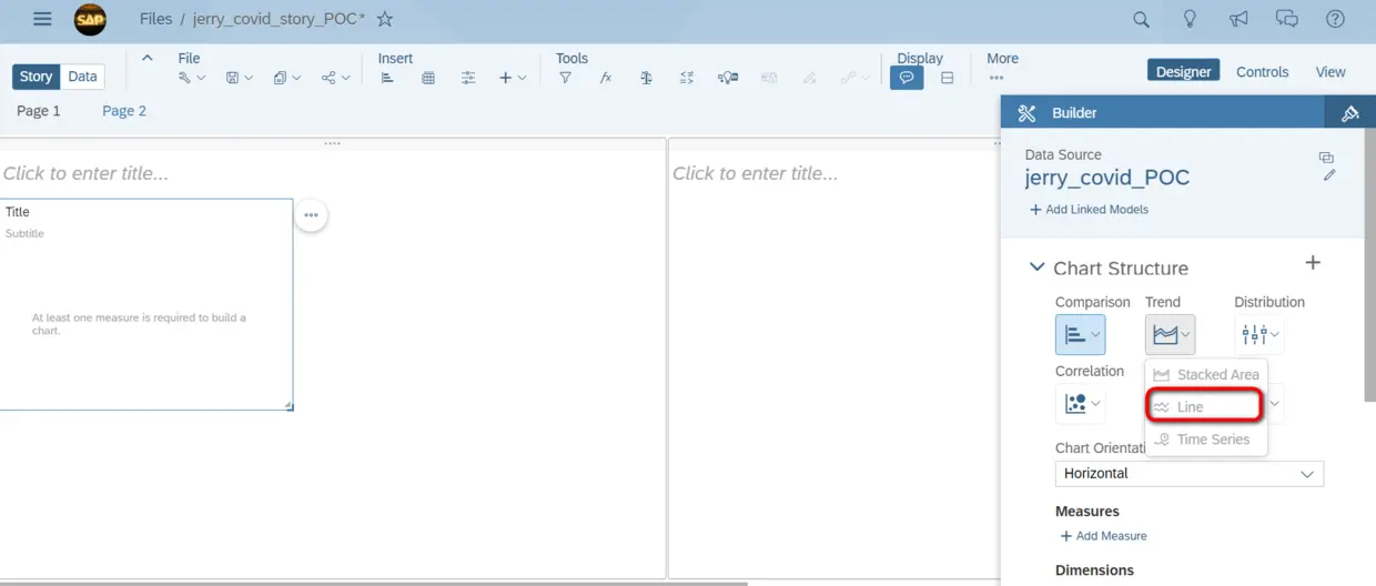 这个模型创建好之后,基于该模型创建一个Story,在空白的页面里插入一个Line Chart(线状图):