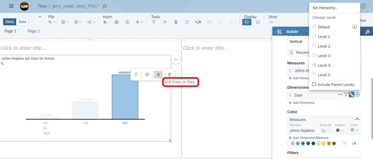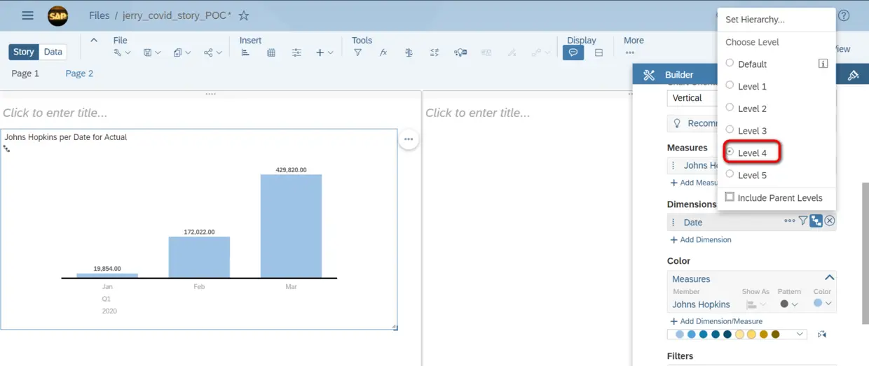 SAP Analytics Cloud会默认将Date这个日期类型的Dimension对应的数据进行汇总(Aggregation),因此我将层级结构设置为4,这样得到的统计图表如下图所示: