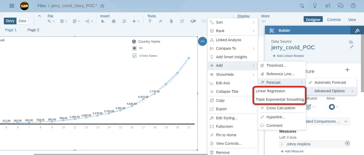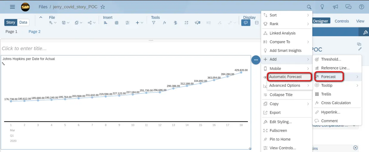 此时如果要查看SAP Analytics Cloud根据历史数据预测出最近的将来可能会到达的数据,只需要在Line Chart里选择Forecast->Automatic Forecast: