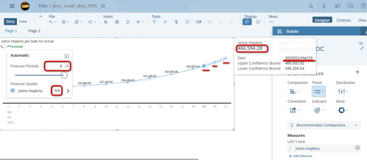 预测完成,SAP Analytics Cloud将这次预测的质量评分为最高分5分,预测出了未来三天即3月19日,3月20日,3月21日的全球确诊人数。