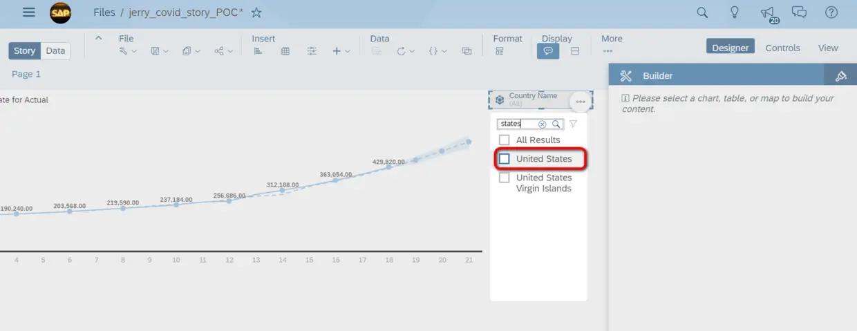 同样的,我们可以设置过滤器,仅仅查看SAP Analytics Cloud根据过去的历史数据,预测出某一个国家未来三天可能达到的确诊数字: