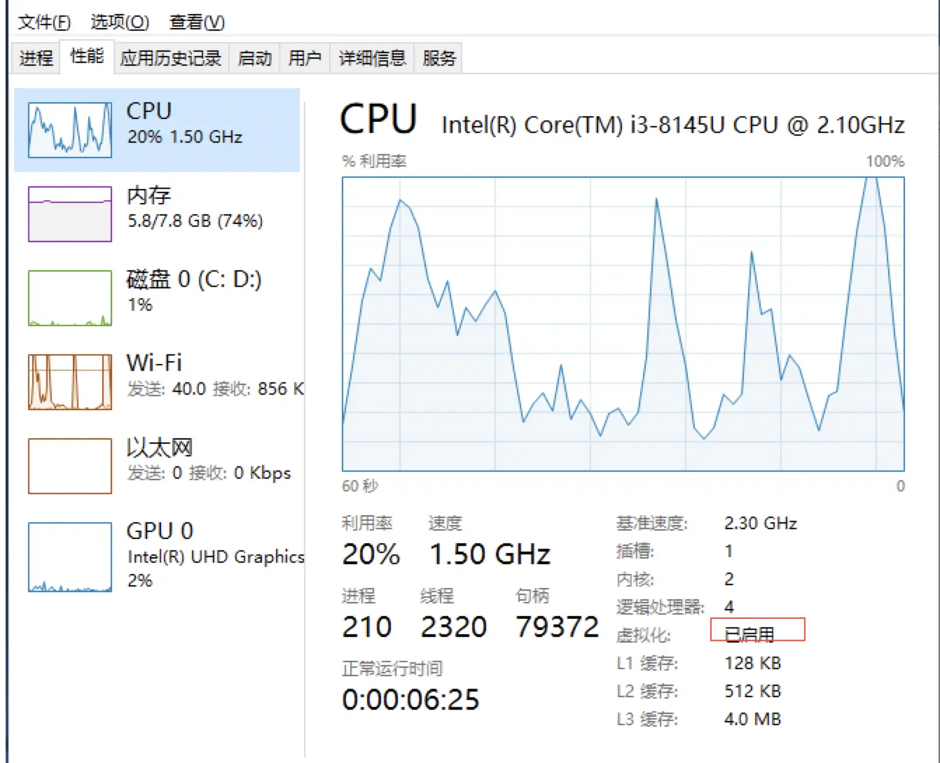 如果是禁用状态,进入BIOS > >Intel Virtual Technology> Enabled,按F10保存设置。进入系统后再次查看虚拟化已开启。