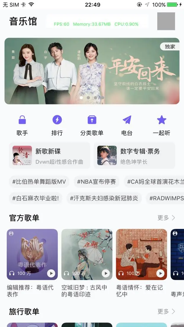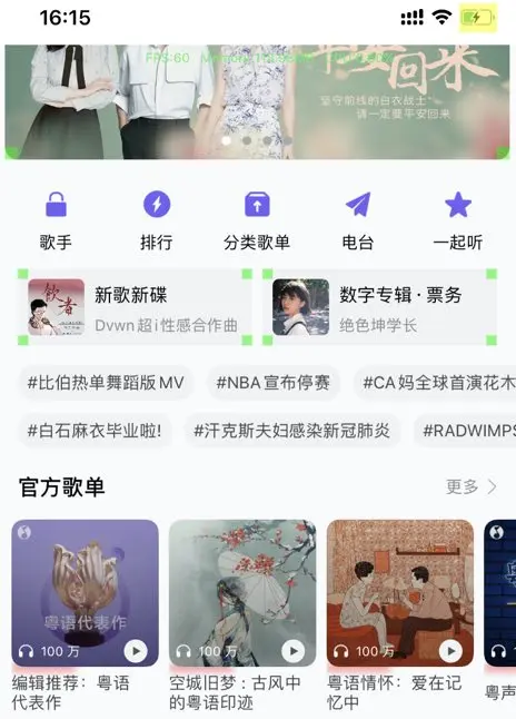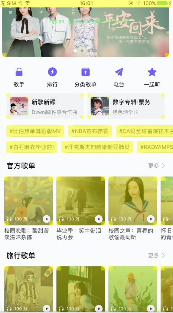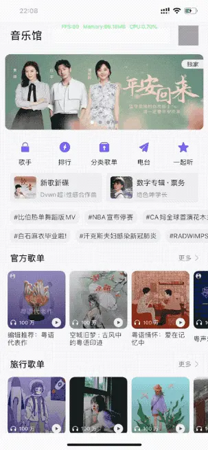 往下的可以横向滚动的视图都用UICollectionView实现, 其中分为多种不同的Cell. QQ音乐首页的Cell种类是后台配置的, 我这里只挑选其中几种实现, 其他的都是一样的道理.