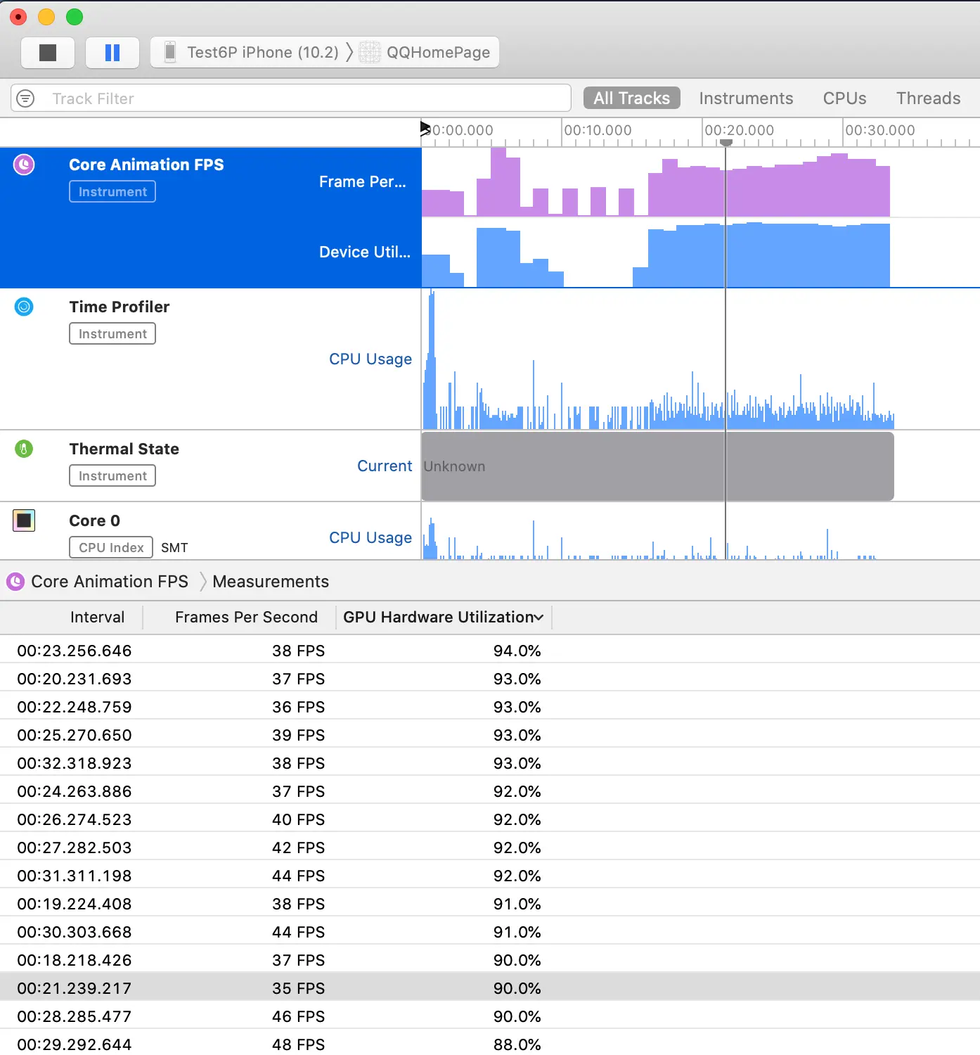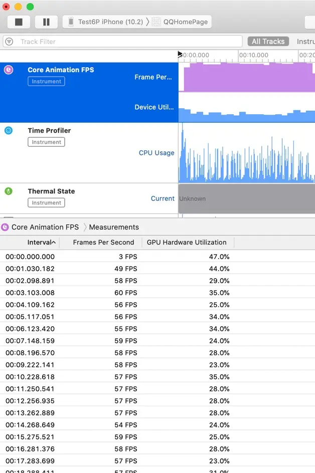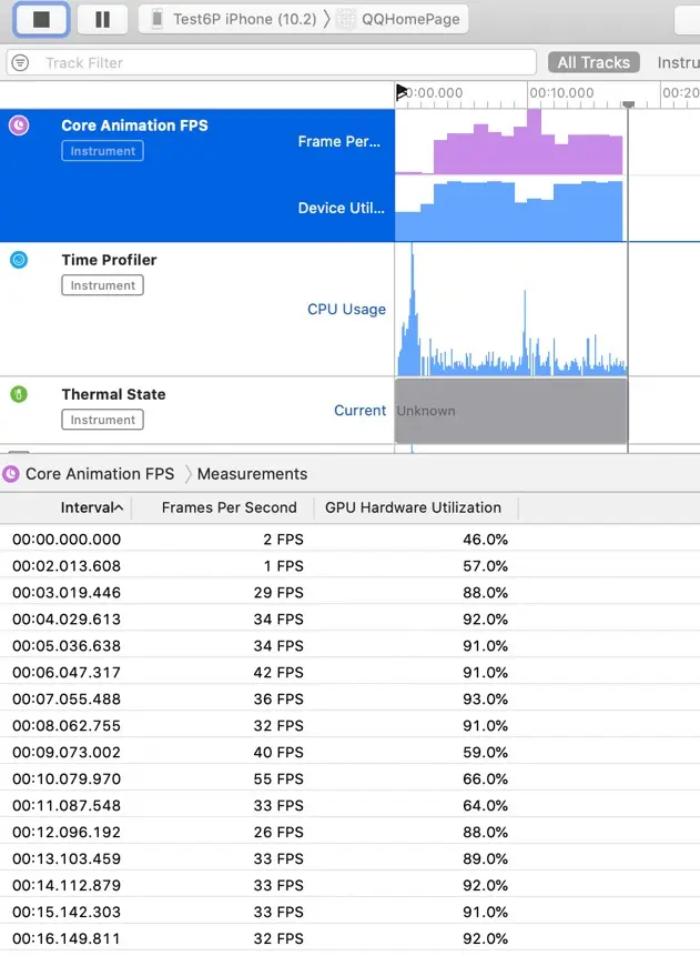 不过有一点让我觉得奇怪的是, 屏幕上显示的FPS一直是60, CPU占有率只有15%, 这种卡顿很容易让人猜出来是GPU处理不过来. 因为FPS指示器用的是CADisplayLink加一个整形变量实现的, 计算出CADisplayLink每秒调用的次数就是帧率. 既然这个FPS一直是60, 那么意味着CPU还是能处理的过来的.