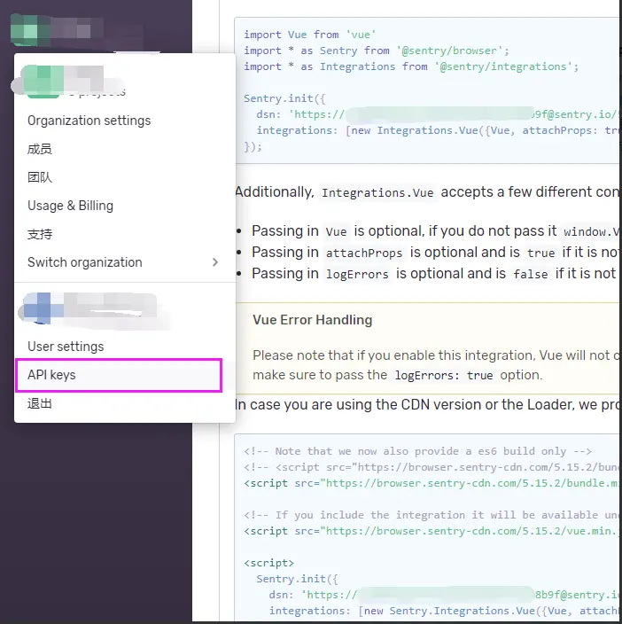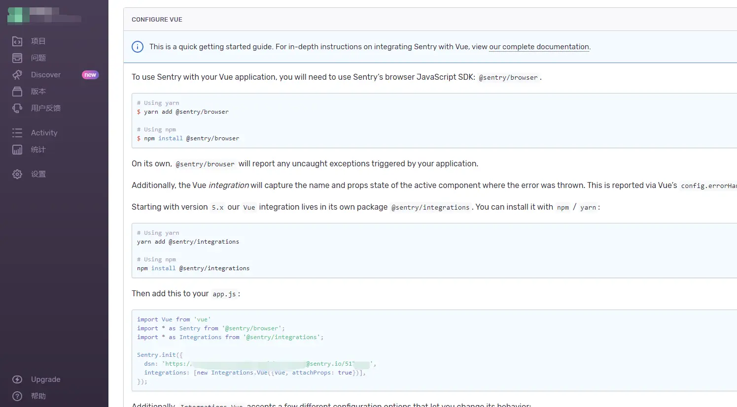 - 按照它的提示操作,在你的vue项目中安装 @sentry/browser 和 @sentry/integrations