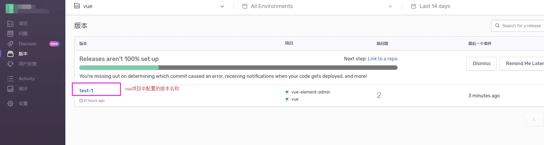 - 以上配置完,我们还需要创建sentry项目的版本号,在错误日志中就能看出是哪个版本的代码报错,在文件 .env.production中配置版本号test-1,这里的版本号必须和vue.config.js中配置的release版本号一致