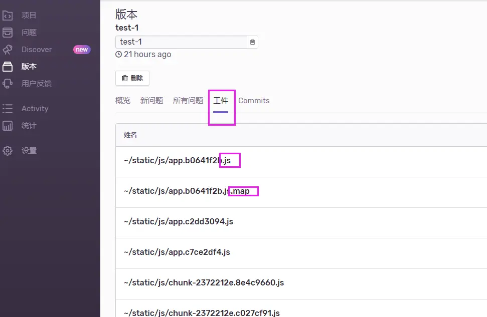 - 执行yarn build打包项目,在sentry系统你会看到在工件中有打包文件中的js和map文件