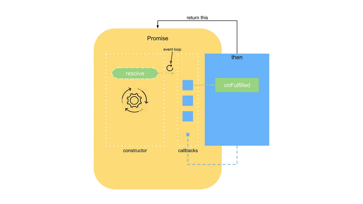 首先 new Promise 时,传给 Promise 的函数设置定时器模拟异步的场景,接着调用 Promise 对象的 then 方法注册异步操作完成后的 onFulfilled,最后当异步操作完成时,调用 resolve(value), 执行 then 方法注册的 onFulfilled。