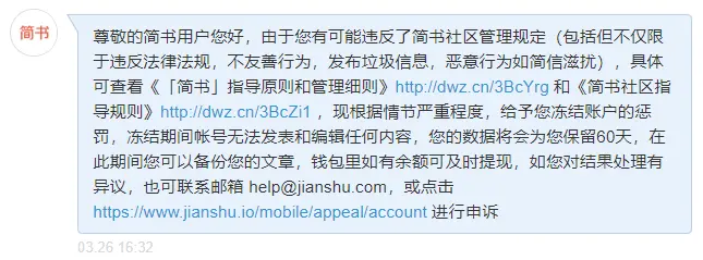 当时我没有太多关注这件事,只是听说简书这个平台很恶心,但我之前写文章把简书当成免费图床用习惯了,也就懒得换,直到后来我的文章接二连三被封。。。