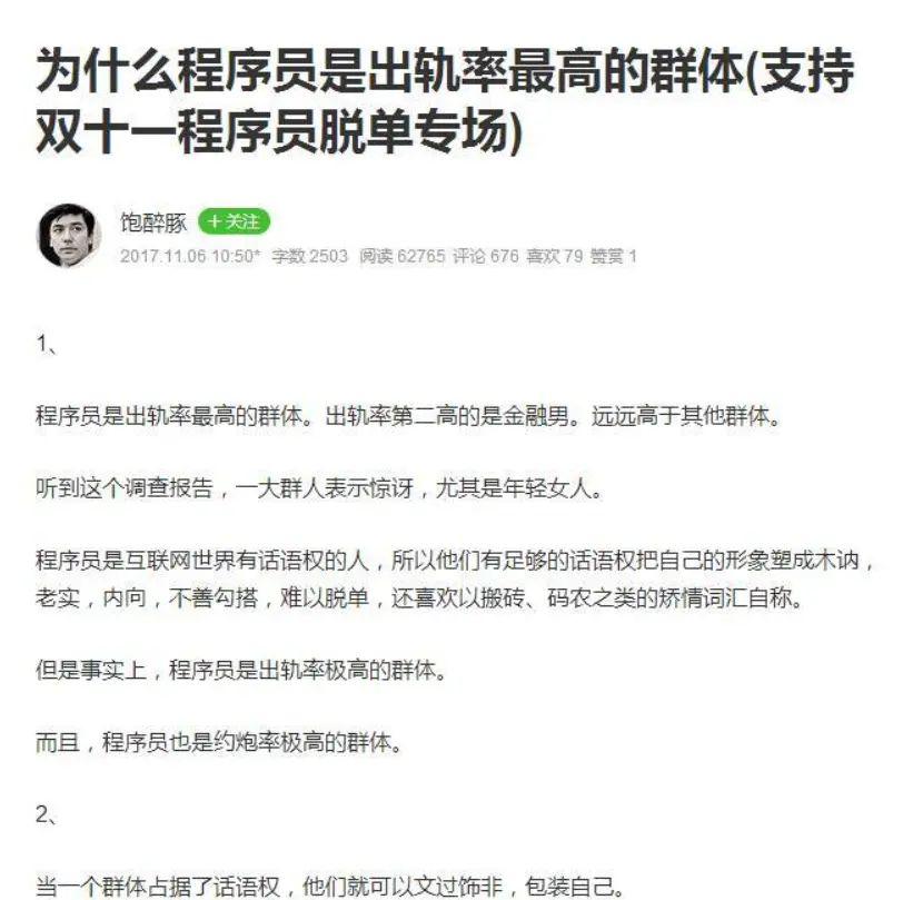 如何看待简书大V饱醉豚 写的《为什么程序员是出轨率最高的群体》? - 知乎 www.zhihu.com/question/26…