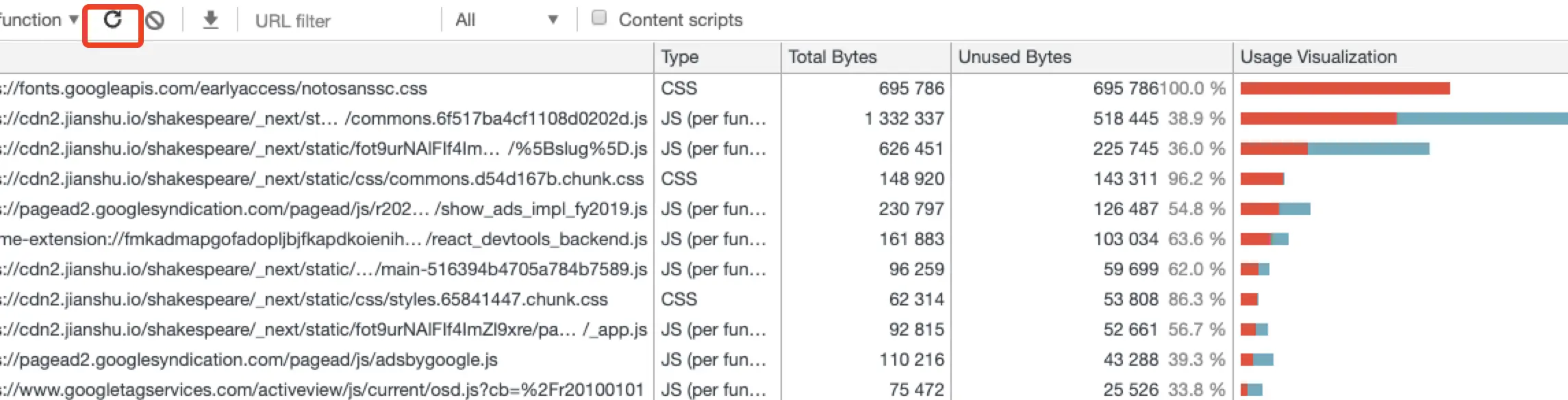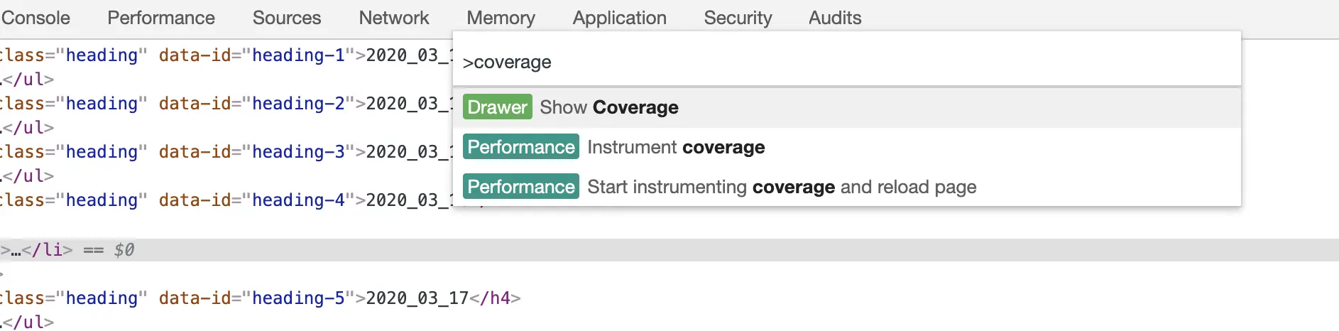 前端性能查看及其代码调试相关积累 我是素萌萌哒 2020-03-30 428 阅读1分钟 如何查看代码利用率? 打开 Chrome Dev Tool; 按下 Cmd + Shift + P or Ctrl + Shift + P ; 输入 Coverage,并选择第一个出现的选项; 点击面板上的 reload 按钮,查看整个应用 JavaScript 的代码利用率;