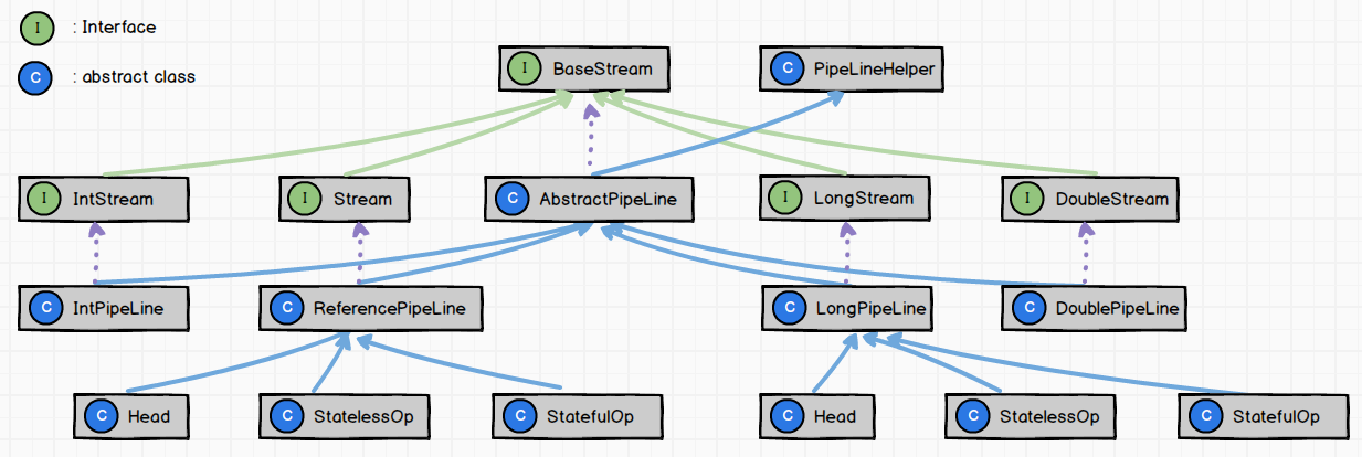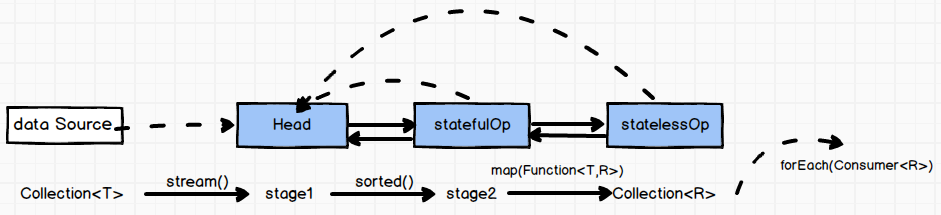 那多个Stream通过中间操作相连接的过程,就是将具有先后顺序的stage连成了一条流水线,直到有一个Stage执行了TerminalOp。每一个Stage都保留着从AbstractPipeLine继承到的sourceStage,该引用指向Head。