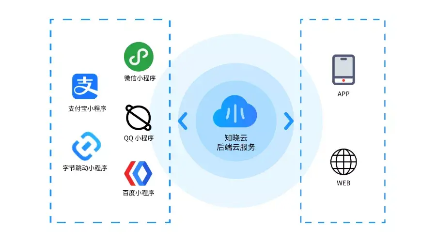 目前,知晓云已成功点亮各大主流小程序平台,同时也支持 Web 、iOS、Android 的开发,帮助企业将业务拓展至互联网的每一个角落。用知晓云开发小程序,轻松又简单,省时省力还省钱。